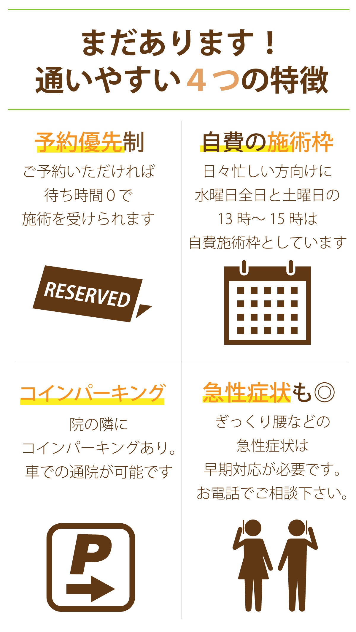 当院は予約優先制ですので、スムーズに施術を受けたい方はご予約をお願いします。
