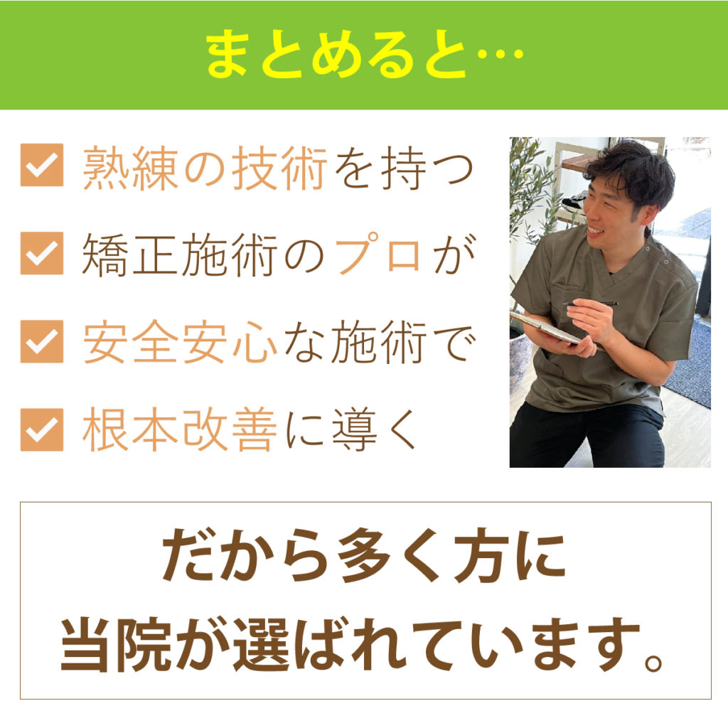 特に体のゆがみを整える矯正施術を磨き上げてきているので、根本改善を得意としています。
