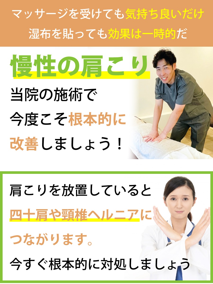 ツラい慢性的な肩こりでお悩みなら、にこ整骨院におまかせください!