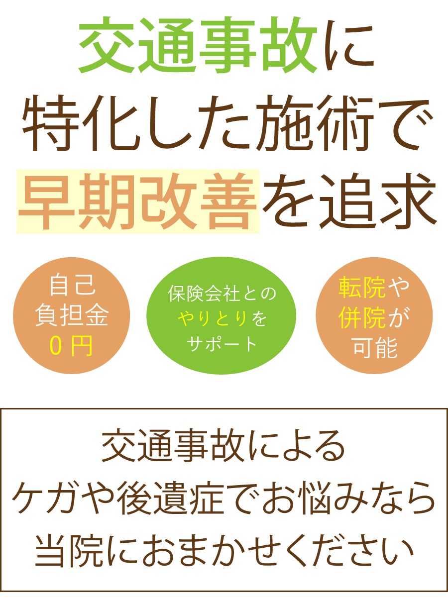自賠責保険が適用される場合、当院での交通事故治療での負担金が0円となります。